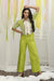 Hand embroidered pearl jacket with a soft ruffle shirt.